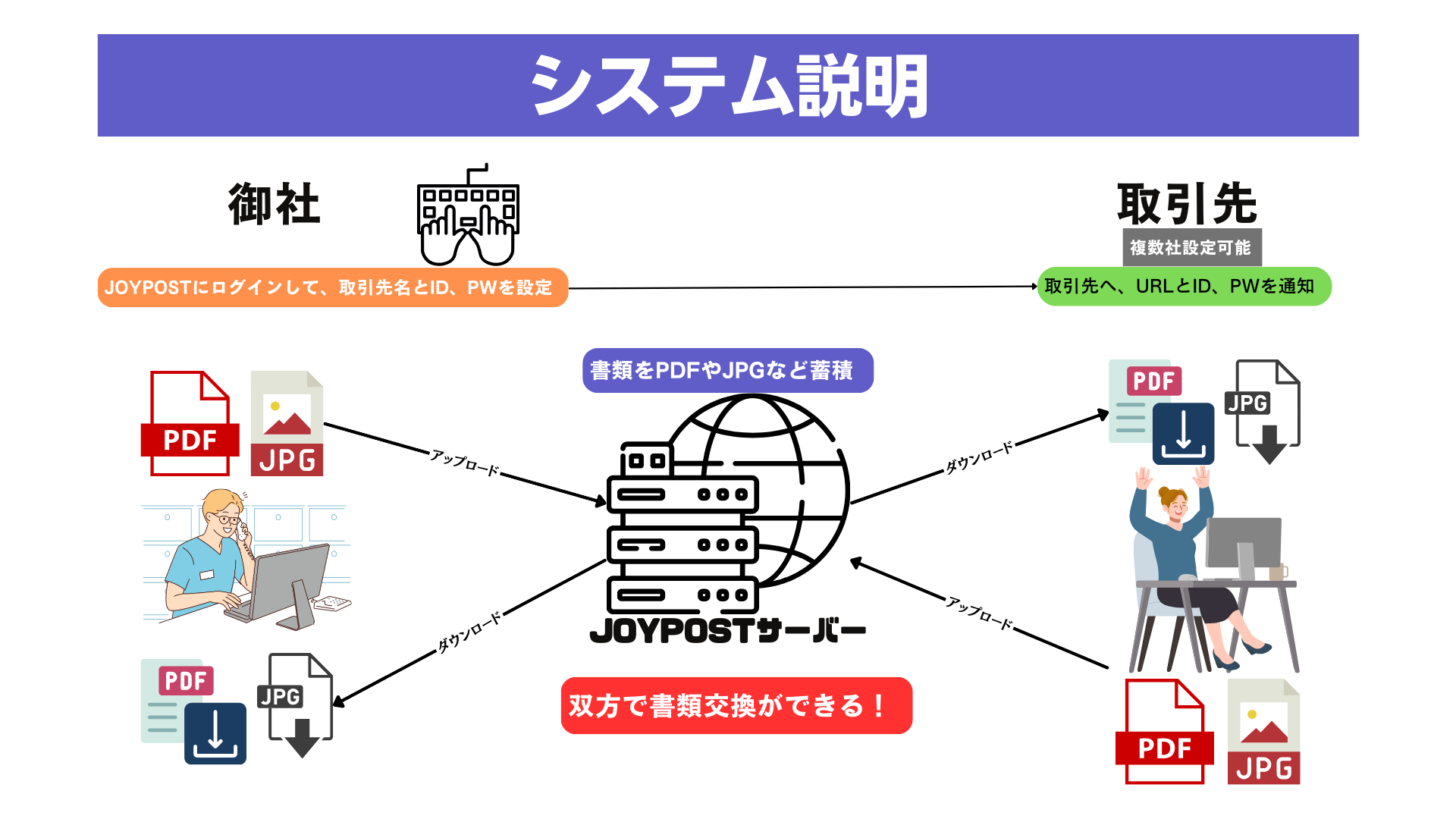 | ●取引先との書類交換が安全にWEB上で簡単に交換することが可能です。 ●取引先が閲覧したのか否かの確認をすることができるので書類が届いてないという心配がありません。 ●簡単に導入できるようにITサポートしますので、お気軽に御相談ください。 |